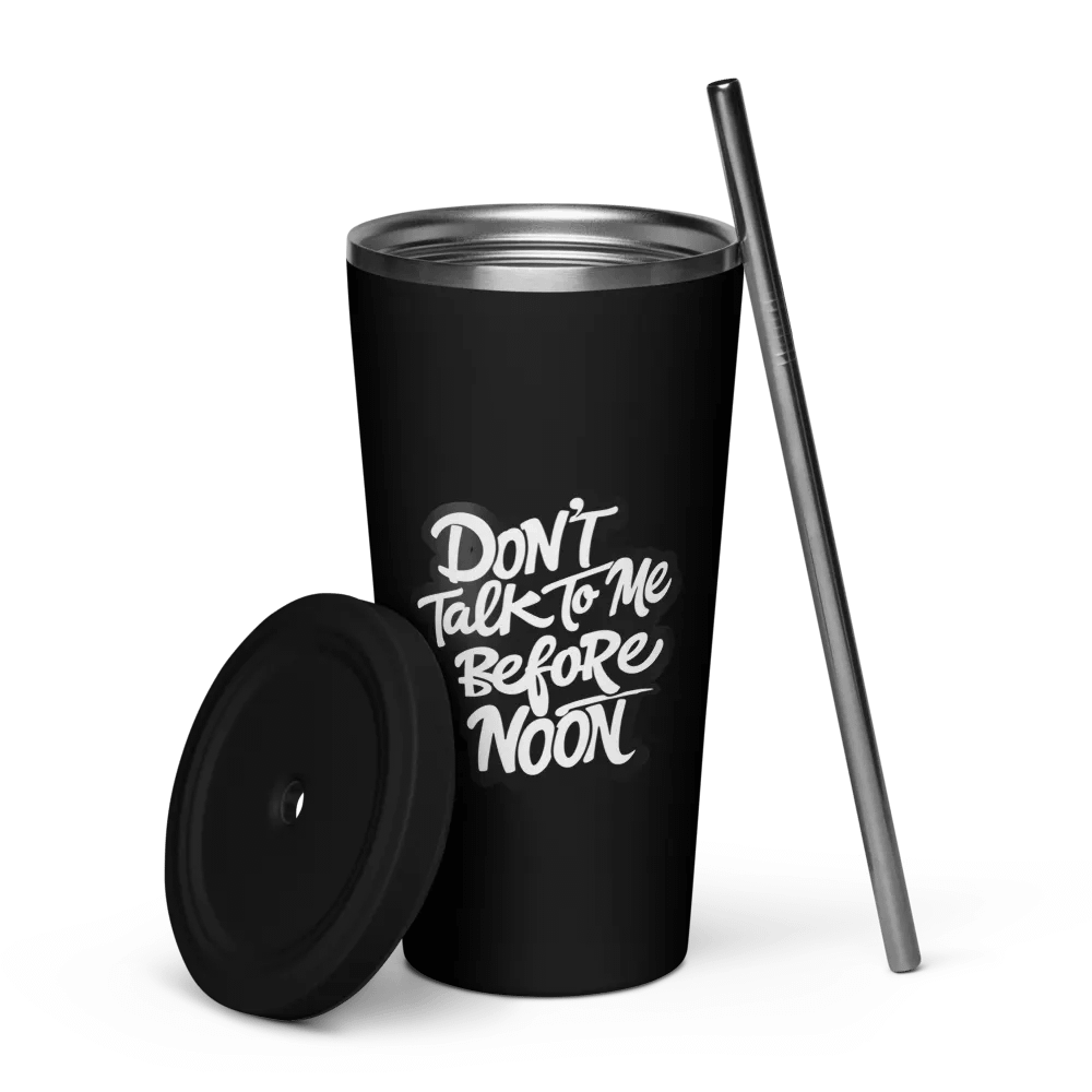 Start your day with a bold statement! This sleek, black 20 oz. tumbler is perfect for those who need a little extra time before engaging with the world. Made from durable materials, it keeps your drinks at the perfect temperature, whether hot or cold. The eye-catching "Don't Talk to Me Before Noon" design adds a touch of humor and style, making it an ideal companion for your morning coffee, tea, or any beverage of choice. Complete with a matching lid and straw, it’s designed for both convenience and personality.